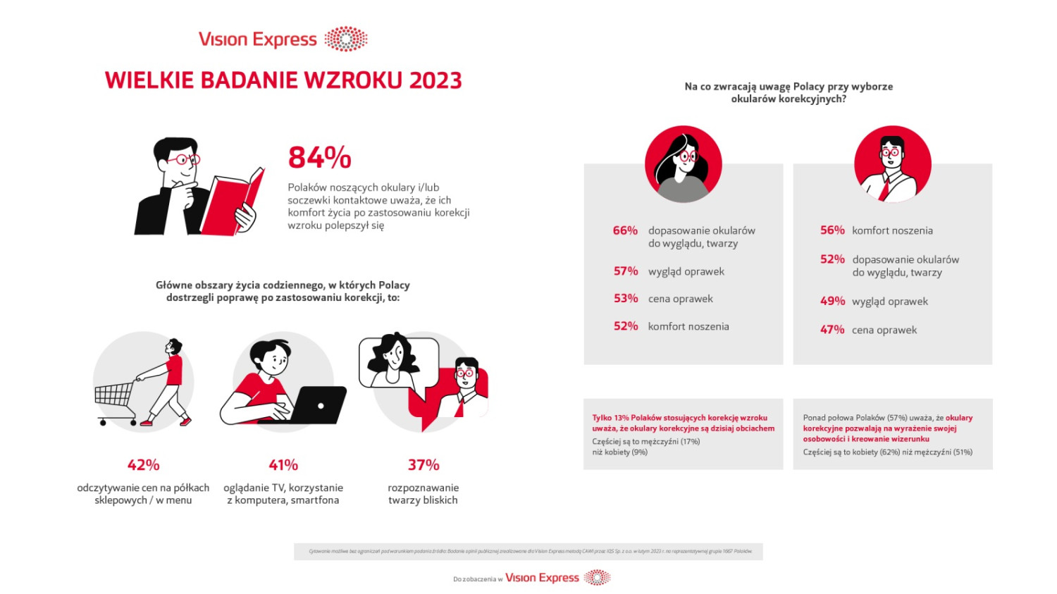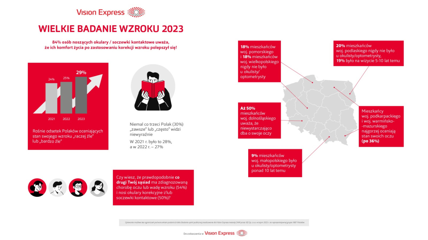 Z roku na rok rośnie odsetek Polaków źle oceniających stan swojego wzroku, a co trzecia osoba „zawsze” lub „często” widzi niewyraźnie – alarmuje Vision Express, prezentując wyniki najnowszego ogólnopolskiego „Wielkiego Badania Wzroku” []. Jednocześnie marka zwraca uwagę, że Polacy po zastosowaniu korekcji wzroku odczuwają większy komfort życia.